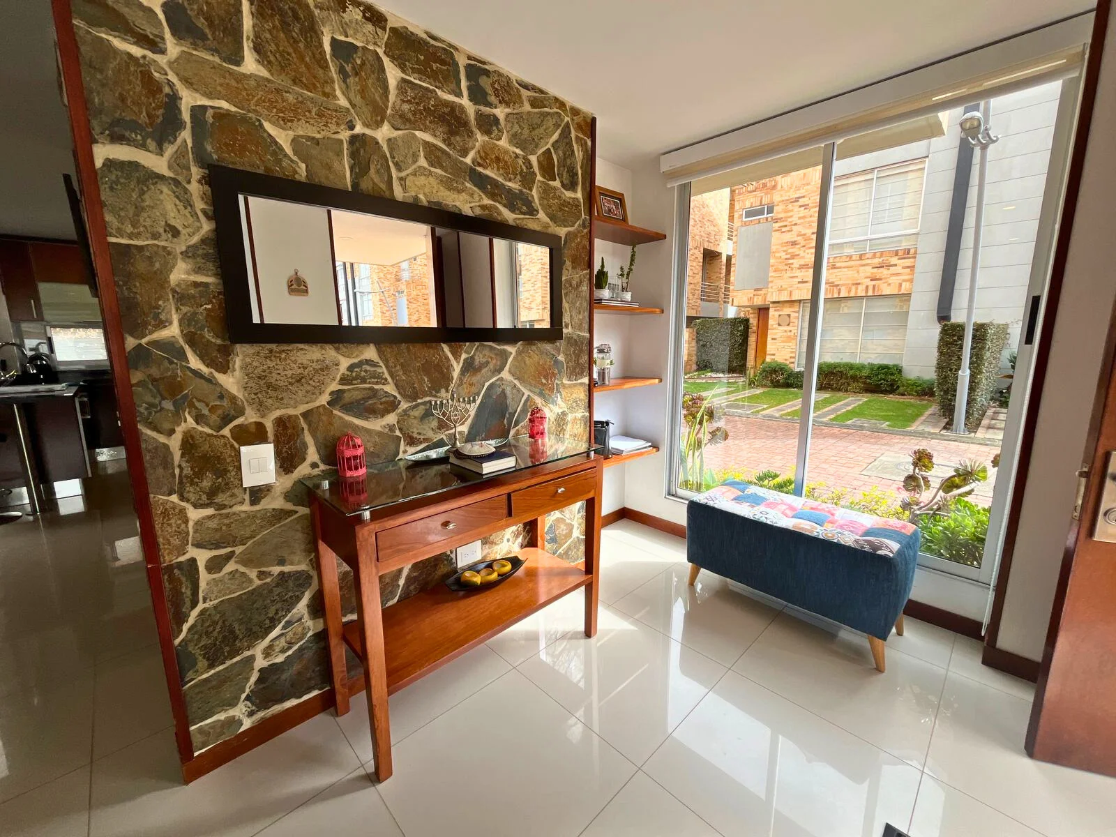 En el primer nivel se encuentra la zona social con espacios amplios y funcionales, estudio independiente ideal para trabajo en casa, cocina integrada de excelente tamaño y salida directa a una terraza conectada con un jardín enchapado, perfecto para reuniones, descanso o actividades al aire libre con bajo mantenimiento.